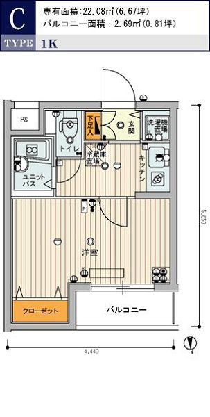 | 間取り | 1K | 専有面積 | 22.08m2 | 敷金 | 0ヶ月 | 礼金 | 0ヶ月 |